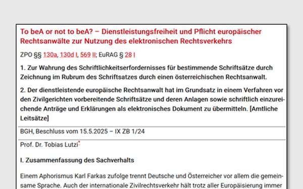 To beA or not to beA? – Dienstleistungsfreiheit und Pflicht europäischer Rechtsanwälte zur Nutzung des elektronischen Rechtsverkehrs, in: RDi 2025, 601–604