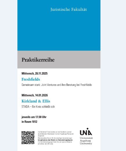 (...) Im Rahmen der Praktikerreihe bietet sich den Studierenden die Möglichkeit, erste Kontakte zu bekannten Kanzleien zu knüpfen und so spannende Eindrücke zu gewinnen.