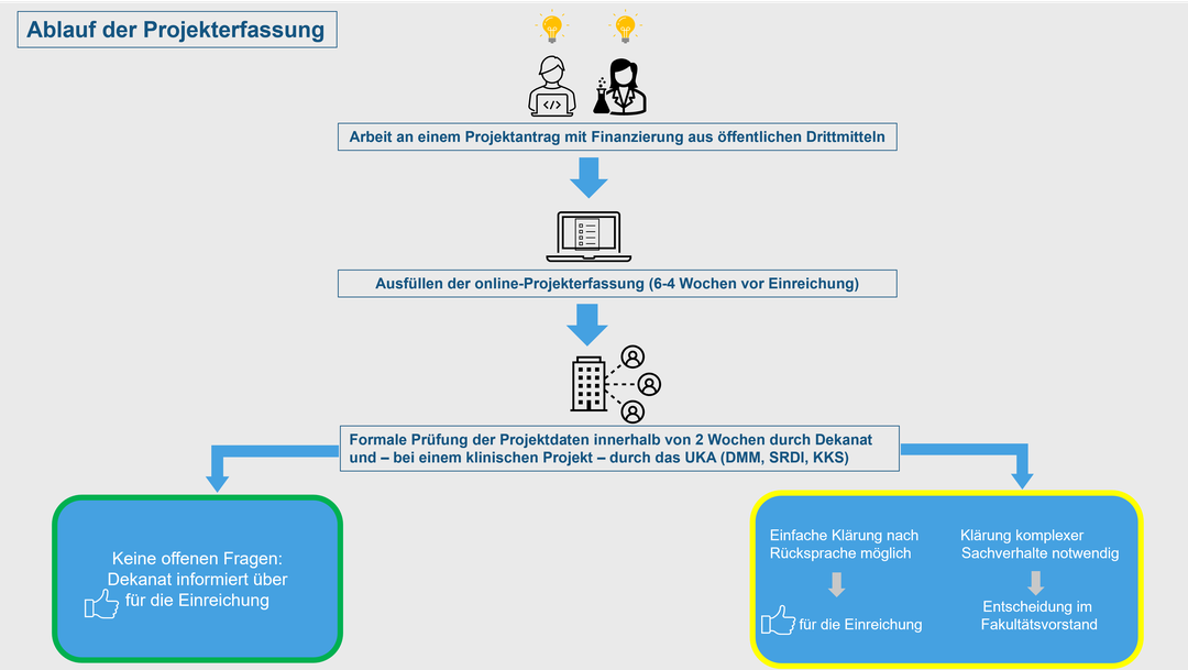 Die Einführung der prospektiven Projekterfassung bildet den ersten Schritt in einem längerfristig angelegten Prozess, an dem das Dekanat und das UKA im Rahmen der „AG Projekterfassung“ unter Leitung des Forschungsdekans für klinische Forschung, Herrn Prof. Raake, arbeiten.