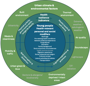 Konzept von GROW. Äußerer grüner Kreis: städtische Klima- und Umweltfaktoren, die sich pathogen und salutogen auf die Gesundheit junger Menschen auswirken. Dunkelgrüner mittlerer Kreis: Indikatoren für die Gesundheitsresilienz, die wichtige und langfristig wirkende Aspekte der Gesundheit junger Menschen umfassen. Blauer innerer Kreis: persönliche und soziale Modifikatoren, die die Beziehungen zwischen Umwelt und Gesundheit stark prägen und bestimmen.