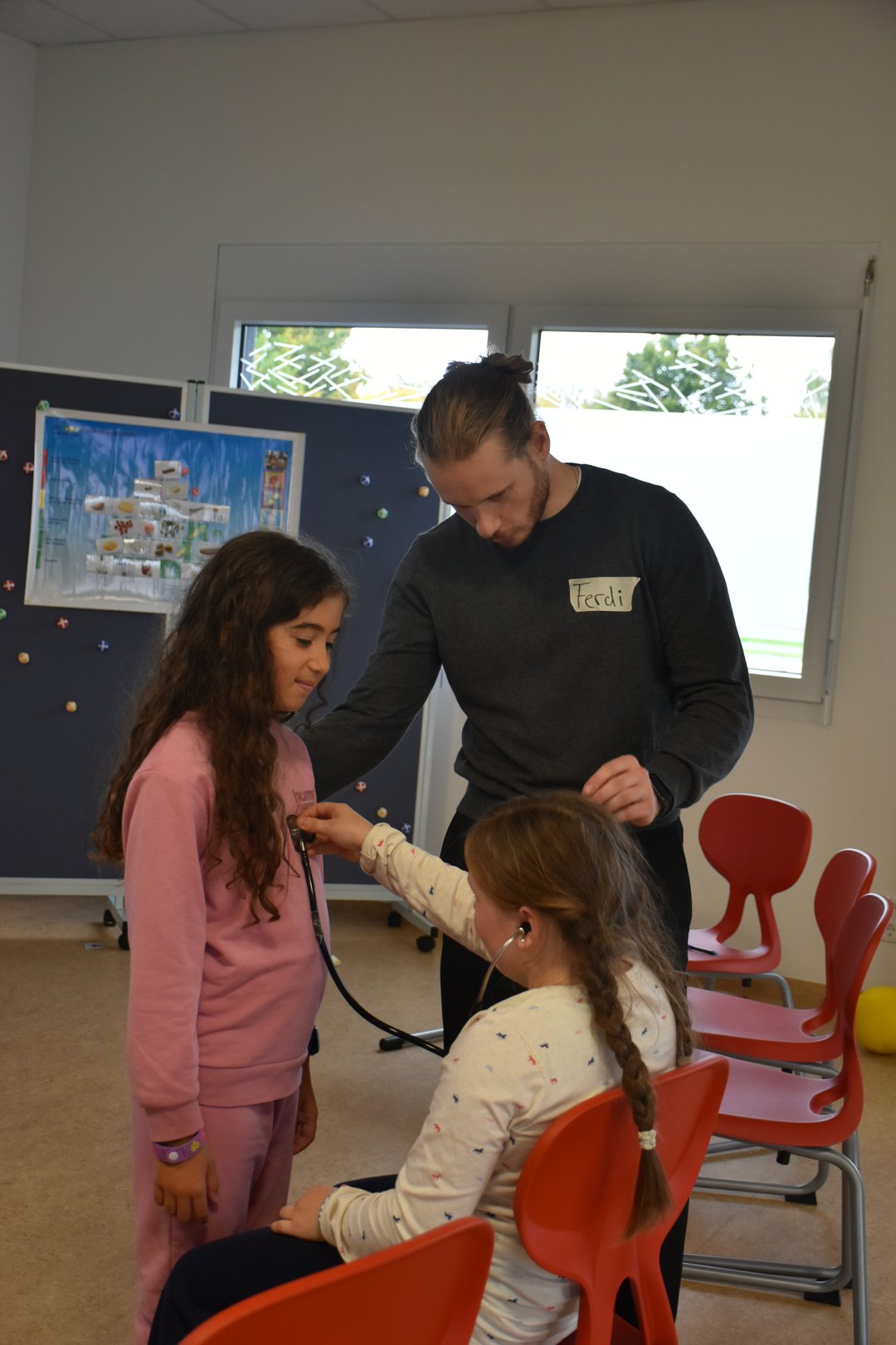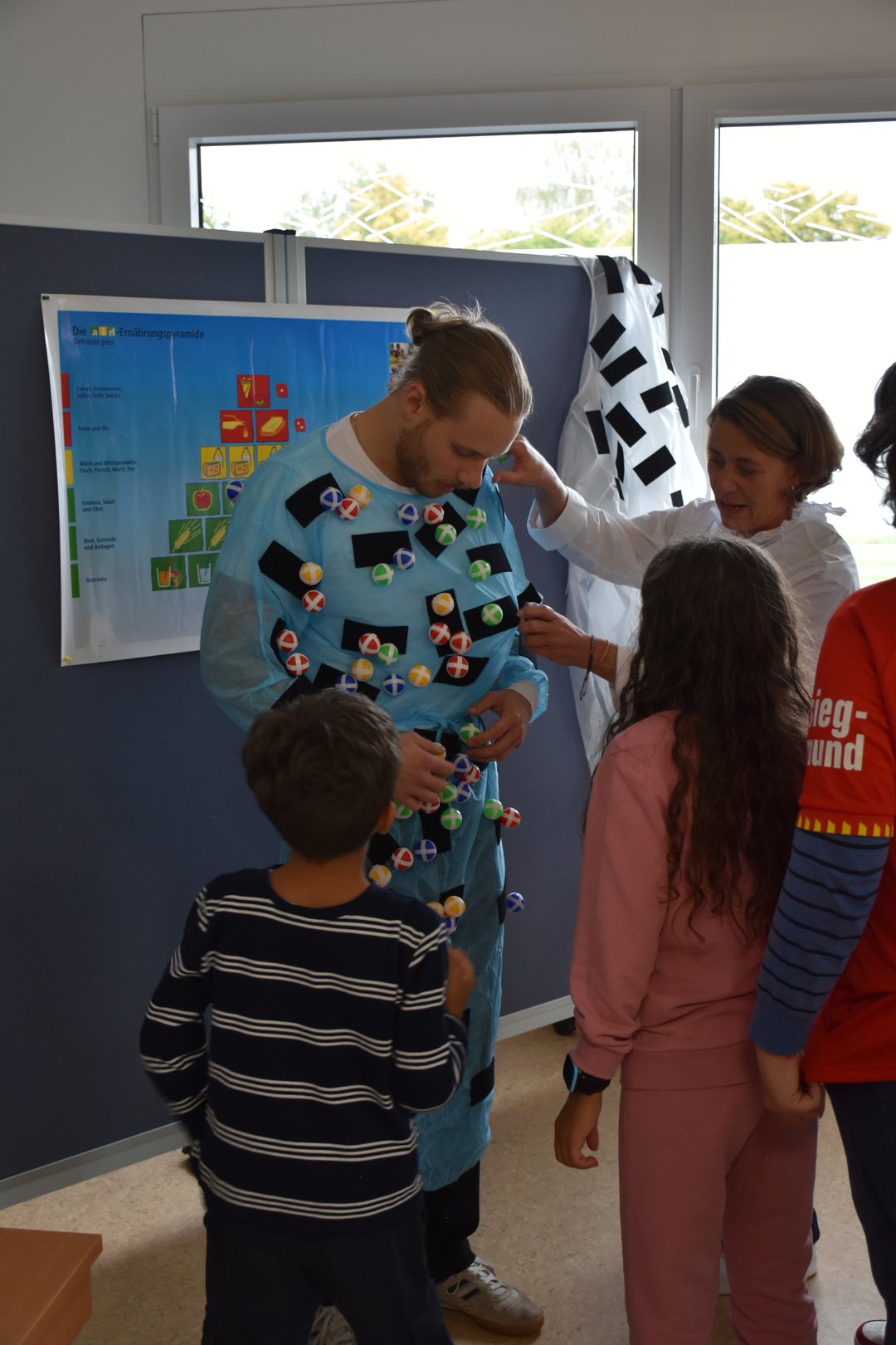 Eierkartons – mit oder ohne Bauschaum – simulierten den intakten oder durchlässigen Schutzmantel der Haut, eine gut gepflegte und eingecremte Haut – als Kostüm getragen – widerstand allen auf sie einprasselnden Einflüssen, also dem Pompon-Hagelsturm, den die Kinder mit vollem Einsatz auf sie abfeuerten. Mit Hilfe der Ernährungspyramide konnten die Kinder sich erarbeiten, was zu einer gesunden Ernährung gehört und wie sie die Nährstoffe aus Lebensmitteln, die sie eventuell nicht zu sich nehmen dürfen, ersetzen können. Auch der Sport durfte in der Arena natürlich nicht fehlen. Mit Stethoskopen ausgerüstet erforschten die jungen Sportler den Einfluss von Bewegung auf ihren Herzschlag und lernten, wie sie ihre Haut trotz Schwitzens beim Sport möglichst gut bei Laune halten können. Zum krönenden Abschluss gab es noch eine Führung durch die WWK-Arena, zusammen mit einer Begleitperson. In den Interviews, die die Kinder bei der abschließenden „Pressekonferenz“ zur Veranstaltung im offiziellen Presseraum des FCA gaben, standen der Wissensgewinn und Spaß im Vordergrund. Ihr Fazit: definitiv wiederholenswert! Und das auch schon ohne die Boni, die erst nach dem Event noch zu ihnen kommen: ein T-Shirt und die Chance ein Einlaufkind bei einem Heimspiel des FCA sein zu dürfen.