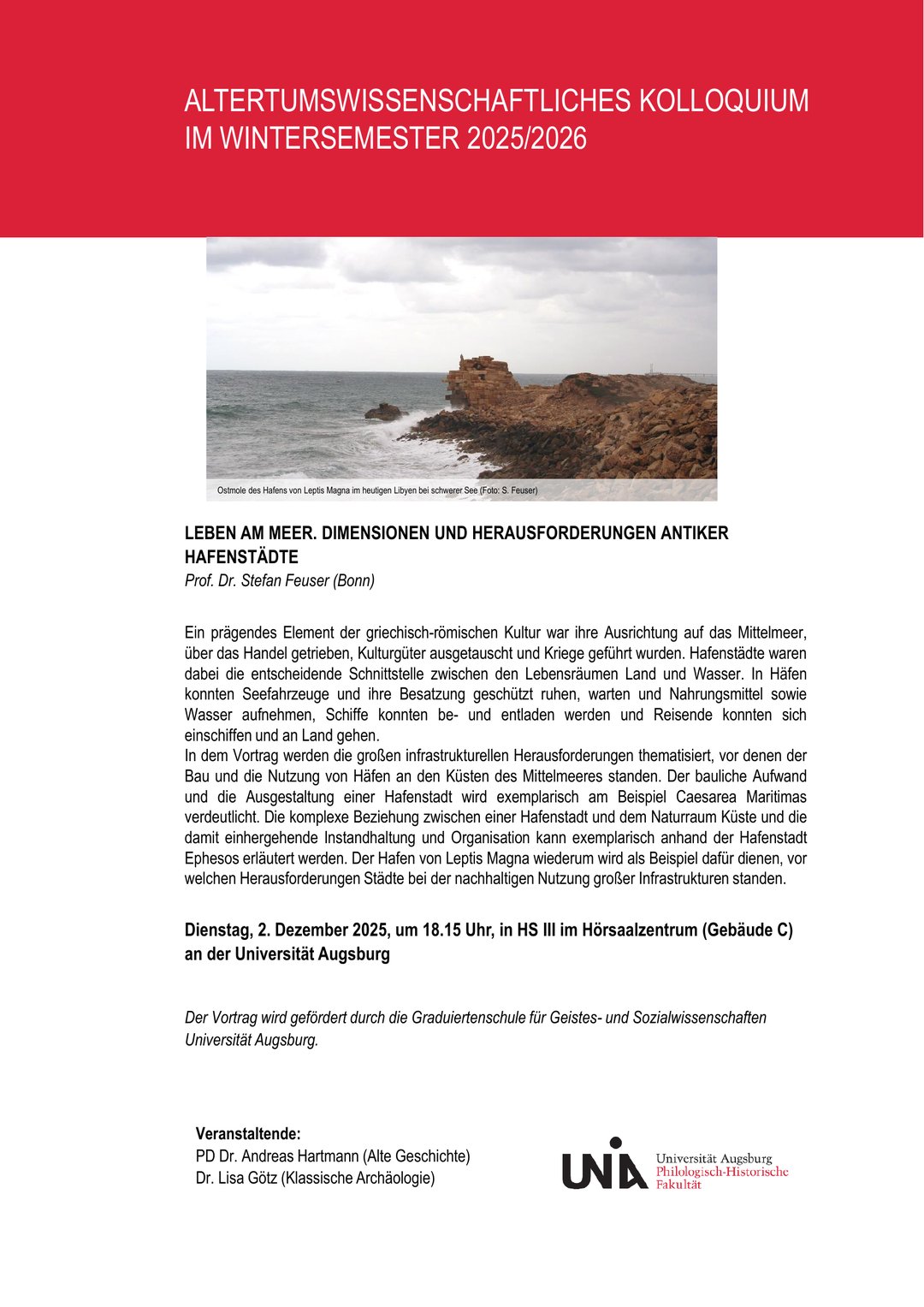 Das Winterprogramm der Alten Geschichte und Klassischen Archäologie an der Universität Augsburg. Der Gestank der Großstadt. Zur olfaktorischen und moralischen Bewertung urbaner Kultur in der römischen Kaiserzeit 18.11.2025 Die Römer waren schmutzig! Leben am Meer. Dimensionen und Herausforderungen antiker Hafenstädte Die jüdische Gemeinde Alexandrias: zu den Facetten einer zunehmend prekären Situation Ausprägung und Entwicklung der Lebensmittelversorgung der antiken Metropole Ephesos Materielle Realitäten einer antiken Metropole: Wasserversorgung und Quartiersbildung im punischen und römischen Karthago Johannes Chrysostomos und Antiochia am Orontes – der christliche Blick auf eine Metropole der Spätantike Nächster Vortrag am 2.12.2025 in Hörsaal III in Gebäude C, Universität Augsburg: Allgemeine Hinweise zur Durchführung: Mit herzlichen Grüßen