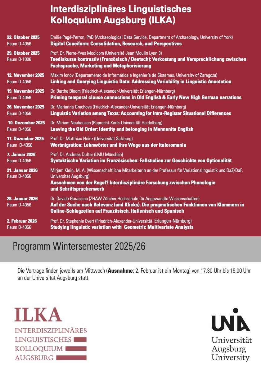 bietet eine breite thematische Vielfalt. Besonders hervorzuheben sind vier Vorträge mit romanistischem Schwerpunkt, unter anderem von Pierre-Yves Modicom (Université Jean Moulin Lyon 3), Matthias Heinz (Universität Salzburg), Andreas Dufter (Ludwig-Maximilians-Universität München) und Davide Garassino (Universität Zürich). Ihre Beiträge widmen sich Fragen der sprachlichen Variation, des Sprachkontakts, der Diskursanalyse und der Wechselwirkung zwischen Sprache, Kultur und Medien. Die Veranstaltungen richten sich nicht nur an Fachkolleginnen und -kollegen, sondern auch an Studierende und Doktorandinnen und Doktoranden, für die die Vorträge wertvolle Einblicke in aktuelle Forschungsthemen und methodische Ansätze der modernen Sprachwissenschaft bieten. Die Vorträge finden im Wintersemester jeweils mittwochs von 17:30 bis 19:00 Uhr im Raum D-4056 statt, sofern im Programm nichts anderes angegeben ist. Alle Interessierten sind herzlich eingeladen, am Kolloquium teilzunehmen und sich an den interdisziplinären Diskussionen zu beteiligen. Das ILKA-Team freut sich auf ein anregendes Wintersemester mit vielen spannenden Vorträgen und lebendigem wissenschaftlichem Austausch. Zur besseren Kommunikation und Information hat das Organisationsteam zudem eine Mailingliste für ILKA-Ankündigungen eingerichtet. Interessierte können sich selbstständig über den folgenden Link anmelden: