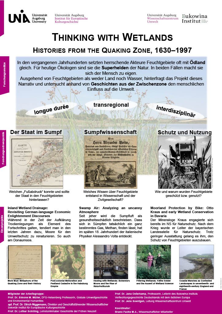 Die erste Veranstaltung, an der die Arbeitsgruppe teilnahm, war der Dies Academicus der Universität Augsburg. Im Rahmen der Posterausstellung Einblicke in die Wissenschaft im Foyer der Jura-Fakultät wurden die einzelnen Teilprojekte zur Geschichte von Feuchtgebieten erstmals präsentiert. Den Semesterabschluss bildete am 9.-10. Oktober 2025 der Workshop „Testing the Ground. Histories from the Quaking Zone,” abgehalten am Wissenschaftszentrum Umwelt (WZU). Mit den Projektpartnern Prof. Jakob Vogel (Sciences Po), Prof. Ludolf Pelizaeus (University of Picardie Jules Verne), Emily O’Gorman (Macquarie University), Kira Meyer (Universität Kiel) und Pietro Omodeo (Ca' Foscari University of Venice) feilte die Arbeitsgruppe an Konzeption, Methodik und Inhalten der Einzelprojekte. Besonders dankbar ist die Arbeitsgruppe für die technisch-naturwissenschaftlichen Eindrücke von Ralph Neumeier aus dem Landesamt für Umweltschutz. Abschluss des Workshops war eine weitere Exkursion in ein nahegelegenes Moor. Im Haspelmoor traf die Arbeitsgruppe Toni Drexler und Alfred Beheim vom Lebensraum Haspelmoor e.V. Sie berichteten von ihrer Vereinsarbeit und zeigten uns ihre Informationstafel so wie das Kunstwerk "meMOORial". Neben diesen Veranstaltungen war das Semester von vielen inhaltlichen Arbeitssitzungen geprägt, in denen sich die Arbeitsgruppe abstimmte und sowohl den größeren methodisch-theoretischen Rahmen als auch die Einzelprojekte weiterentwickelte. Damit war es ein sehr produktives Semester in dem nicht nur theoretische Arbeit, sondern auch viele praktische Erfahrungen zu und mit Wetlands gemacht wurden. Die Arbeitsgruppe dankt ihren externen Projektpartnern für viele großartige Führungen durch verschiedene Feuchtgebiete und wichtiges konstruktives Feedback für das Forschungsprojekt.