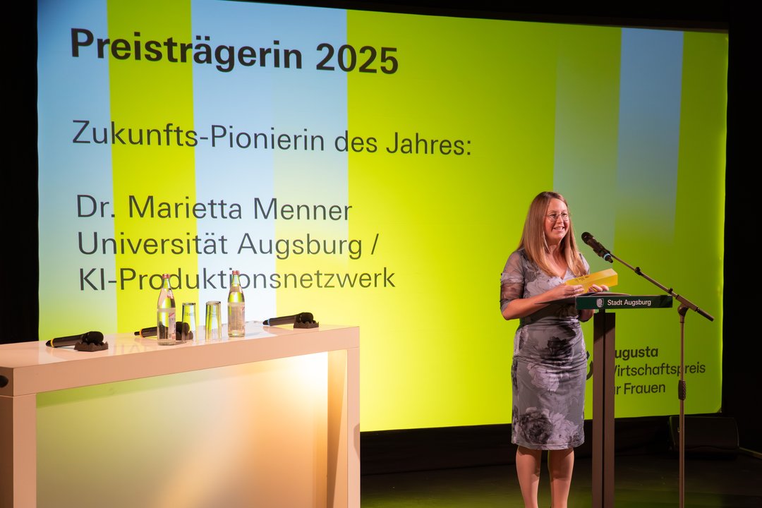 Die Bildungsexpertin Dr. Marietta Menner ist von der Stadt Augsburg als „Zukunftspionierin des Jahres“ ausgezeichnet worden. Die Leiterin des Bildungsprogramms am KI-Produktionsnetzwerk Augsburg sowie MINT-Bildungsverantwortliche am Anwenderzentrum Material- und Umweltforschung erhielt die Ehrung im Rahmen einer offiziellen Feier am 23. Oktober 2025. „Mit dem „Augusta – Wirtschaftspreis für Frauen“ würdigt die Stadt Augsburg außergewöhnliche Unternehmerinnen und ihre bedeutenden Beiträge zur Wirtschaft. Die Kategorie „Zukunftspionierin des Jahres“ richtet das Augenmerk auf Frauen, die durch herausragende Innovationskraft in ihrem Unternehmen oder Forschungsinstitut sowie durch die erfolgreiche Übertragung ihrer Ideen in die Wirtschaft einen wichtigen Beitrag zur Stärkung des Innovationsstandorts Augsburg leisten. In diesem Jahr geht der Preis an Dr. Marietta Menner von der Universität Augsburg. Dr. Marietta Menner erhält die Auszeichnung für ihre außergewöhnlichen Einsatz rund um den Wissenstransfer aus der Universität in die Bildung: Sie treibt seit 2010 den Forschungstransfer und die Sicherung des regionalen MINT-Nachwuchses kontinuierlich voran. Während ihres bisherigen Wegs über den zweiten Bildungsweg kommend - von der Auszubildenden hin zur Vorreiterin im Bereich KI-Bildung - sammelte sie während ihres Lehramtsstudiums an der Universität Augsburg viele Erfahrungen und Kompetenzen im Bildungsbereich, die sie heute weitergibt. In ihrer Laudation würdigt Eva Weber, Oberbürgermeisterin der Stadt Augsburg, die Bildungsexpertin als „eine Frau, die mit visionärer Kraft, wissenschaftlicher Exzellenz und unermüdlichem Engagement den Innovationsstandort Augsburg entscheidend mitgestaltet“. Ein Auszug: 2017 baute sie das erste deutsche Faserverbundschülerlabor auf und 2019 resultierte daraus der von ihr verantwortete Aufbau des DLR_School_Lab der Universität Augsburg. Neben ihrer Tätigkeit als wissenschaftliche Geschäftsführerin des Anwenderzentrum Material- und Umweltforschung (AMU) Universität Augsburg, bei dem sie den Betrieb des DLR_School_Lab und die Koordinierung des regionalen Netzwerks MINT-Region A3 verantwortet, leitet sie das KI-Bildungsprogramm am KI-Produktionsnetzwerk an der Universität Augsburg, ist Themenpatin der BAIOSPHERE im Bereich KI und Kompetenzen und jüngst als Mitglied des neu gegründeten Zentrums für Produktion der Zukunft der Universität Augsburg gewählt worden. In vielen drittmittelgeförderten Projekten widmet sie sich engagiert dem Wissenstransfer zu Unternehmen, Schulen und der Stadtgesellschaft – das bundesweit einzigartige KI-Bildungszertifikat für Auszubildende und das Weiterbildungszertifikat FutureSkillsEngineer für technische Fachkräfte sind nur zwei Beispiele für ihr herausragendes Engagement.