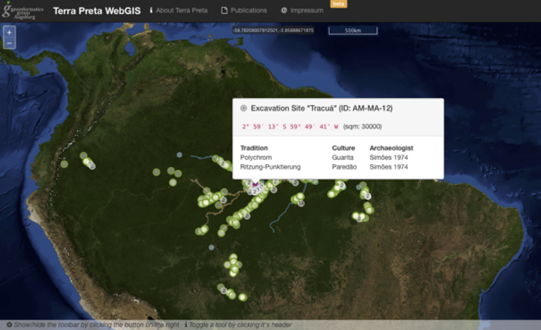 In partnership with archaeologist Prof. Dr. Klaus Hilbert from the Pontifícia Universidade Católica do Rio Grande do Sul (PUCRS) (Brazil) and her research group at the Universität Augsburg, Prof. Timpf co-led an initiative to develop an Interactive WebGIS for archaeological settlement pattern analysis in the Amazon Basin. The project assembled a database of prehistoric settlement sites in Amazonia, designed a web-GIS interface and visual analytics tools to support archaeologists in exploring spatial and temporal patterns of habitation and human-environment interactions in a region where data is often incomplete or scattered. The project was funded through ProBral, which is a cooperation programme between Deutscher Akademischer Austauschdienst (DAAD) and CAPES (Brazilian Federal Agency for Support and Evaluation of Graduate Education).
