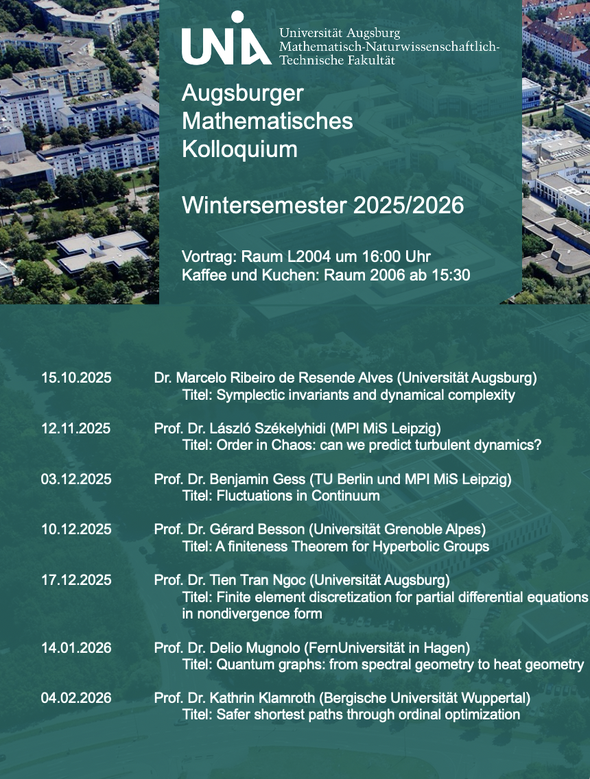 Das Augsburger mathematische Kolloquium ist eine Veranstaltung des Instituts für Mathematik mit dem Ziel, herausragende Sprecherinnen und Sprecher für Vorträge zu gewinnen, die für ein breites mathematisches Publikum zugänglich sind. Vor den eigentlichen Vorträgen gibt es bei Kaffee und Kuchen die Möglichkeit, sich bereits vorab mit der oder dem Vortragenden auszutauschen.